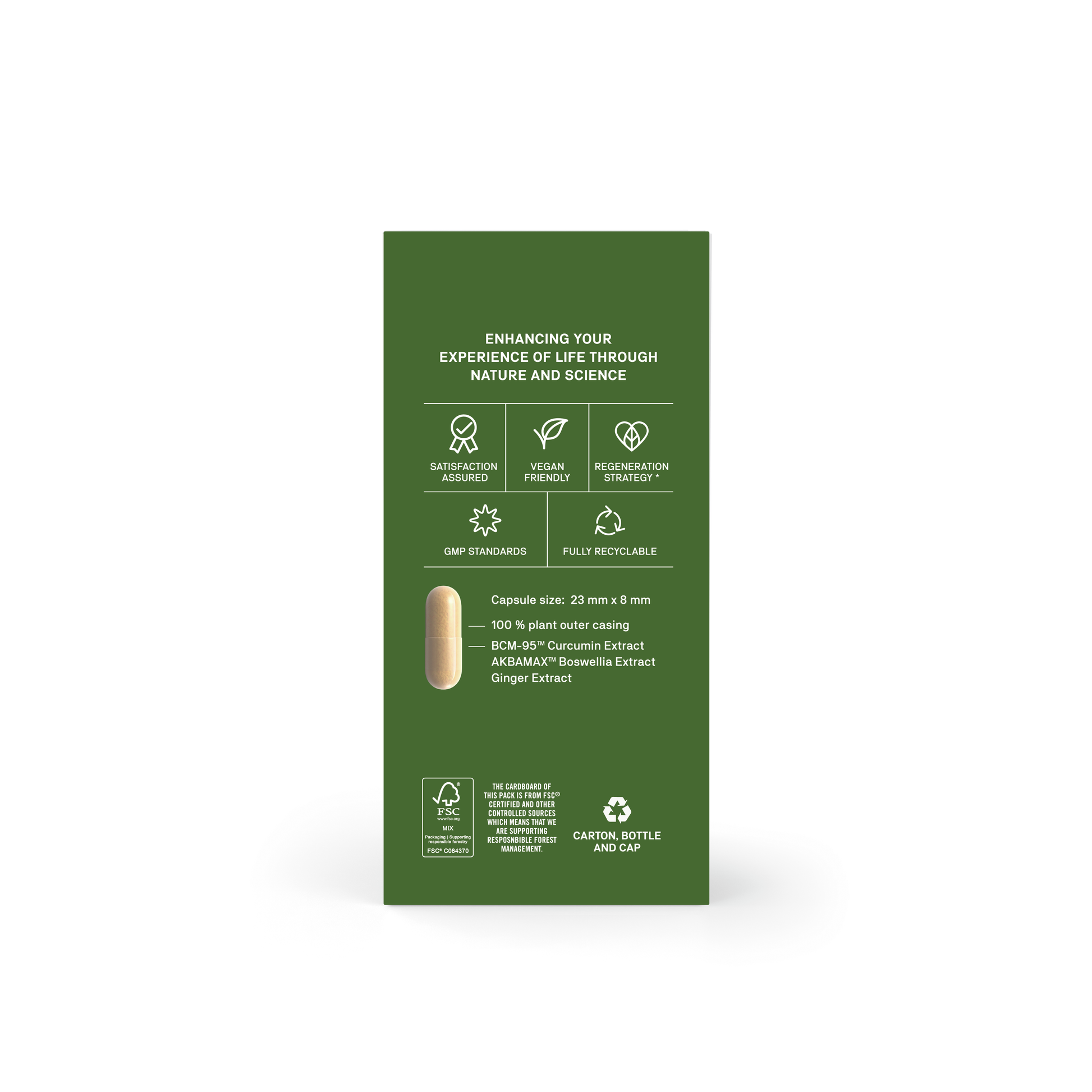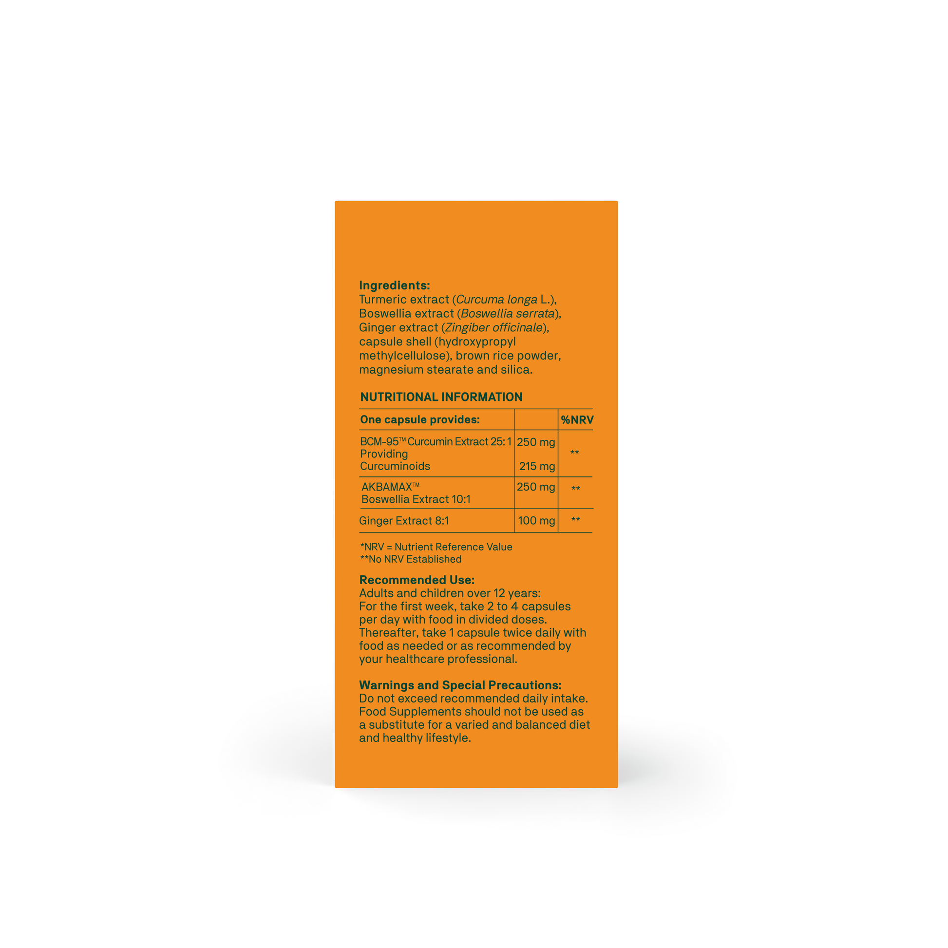 Each capsule contains Curcuma longa L (BCM-95™ turmeric) 25:1 extract (rhizome) 250mg (standardised to contain 95 % curcuminoids with Ar-Turmerone) Boswellia serrata Roxb. ex Colebr. (AKBAMAX™ boswellia) extract (resin) 250mg (standardised to contain 45 % boswellic acids of which 10 % AKBA) Zingiber officinale (ginger) extract 100mg (rhizome) (standardised to contain 5 % gingerol)